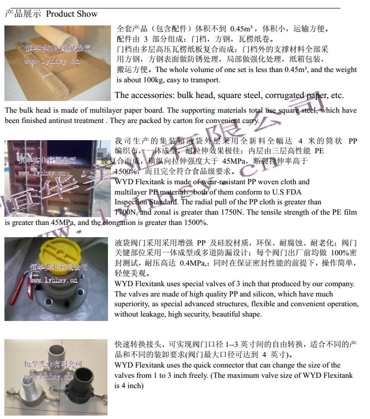 集裝箱液袋是一種新型的能夠儲(chǔ)存和運(yùn)輸各種非危險(xiǎn)液體貨物的軟體包裝容器。該容器主要采用多層結(jié)構(gòu),由外層 PP 編織布和內(nèi)層 PE 膜復(fù)合而成;其體積一般為 14-24 立方米,可一次儲(chǔ)運(yùn) 24000 公升液體;可放置于一個(gè) 20 英尺集裝箱內(nèi),也可置于拖車(chē)掛斗中,實(shí)行門(mén)到門(mén)運(yùn)輸,適合海、陸多種運(yùn)輸方式。相對(duì)于傳統(tǒng)的罐、桶等液體容器,可大量降低包裝、裝卸及物流成本。